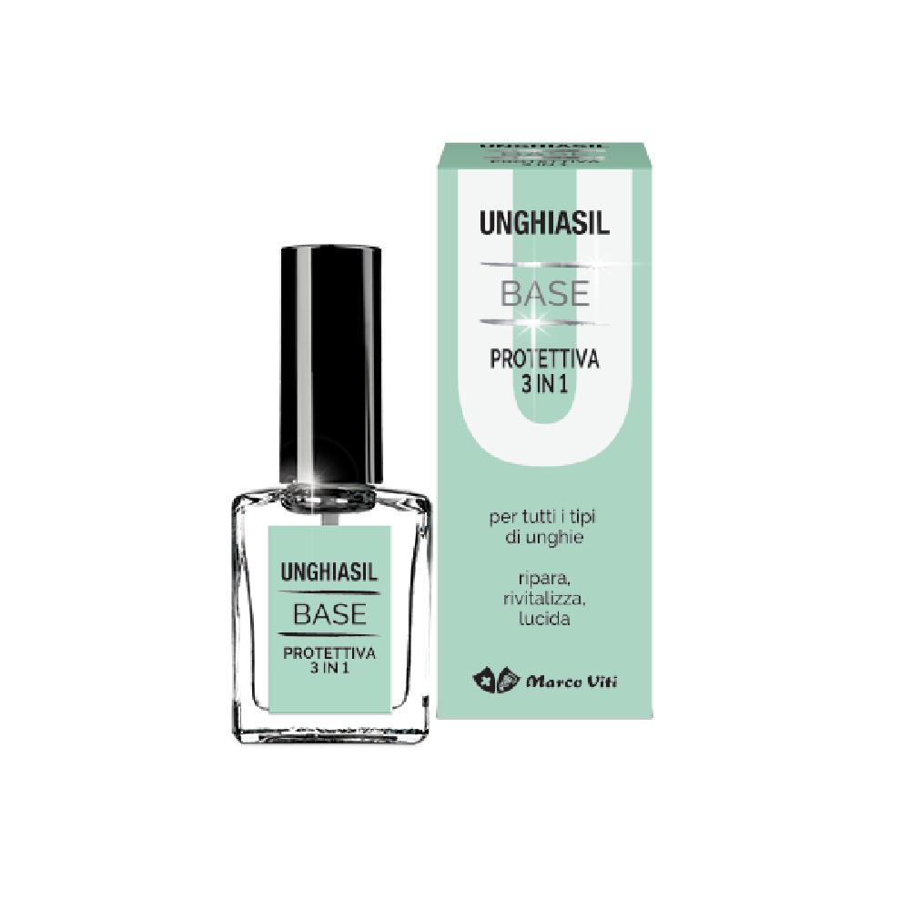 Unghiasil base protettiva 3 in 1 è un trattamento multifunzione. Dal finish incolore, può essere utilizzato come preventivo rivitalizzante e illuminante, oppure come base prima dello smalto.