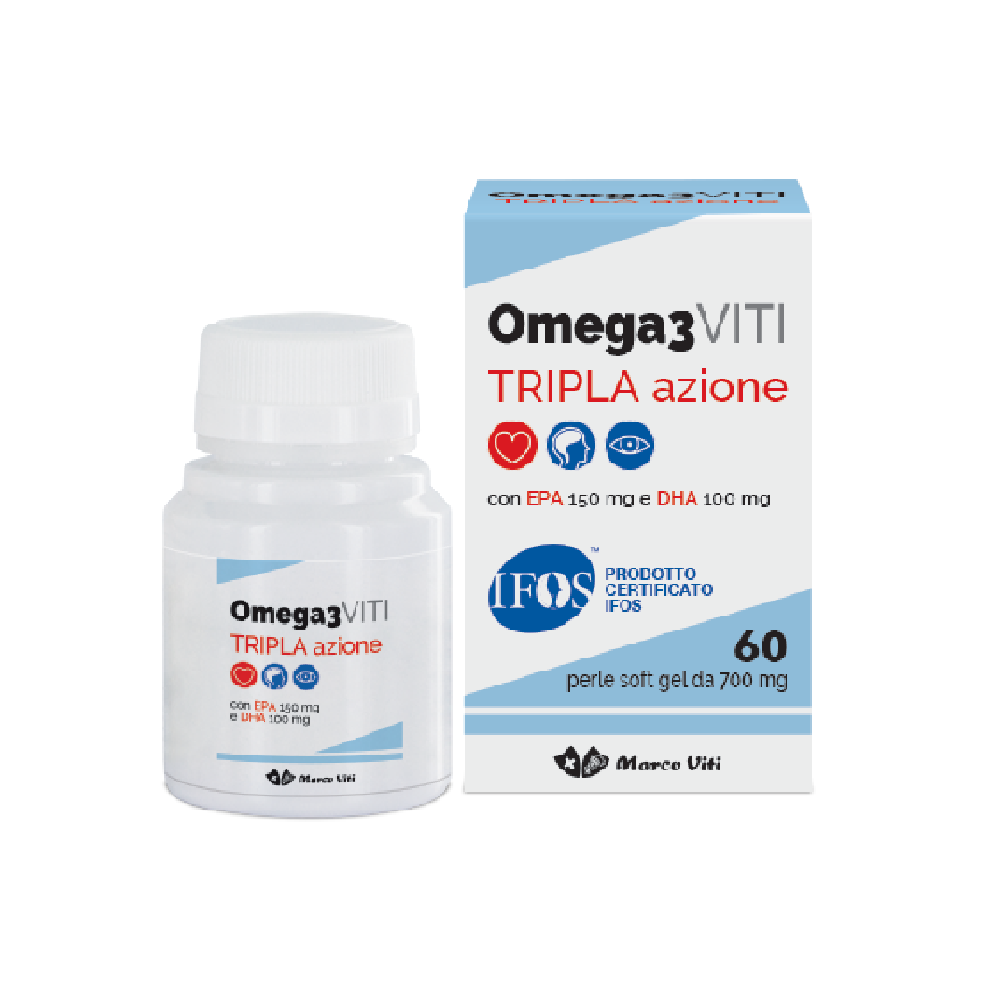 Omega 3 Viti Tripla Azione è un integratore alimentare con 150mg EPA e 150mg DHA per singola perla. 250 mg di EPA e DHA sono utili al mantenimento delle normali funzioni cerebrali e visive.