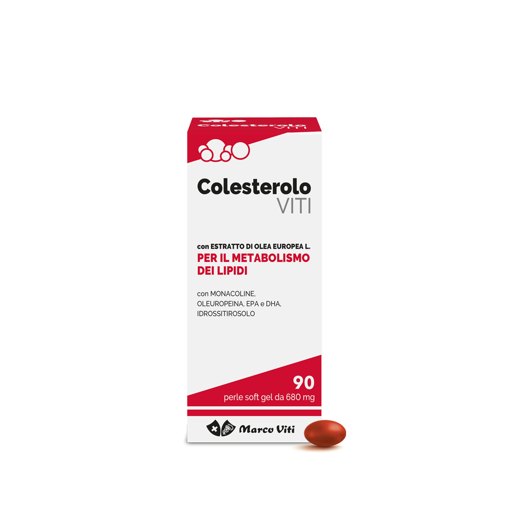 Colesterolo Viti è un integratore alimentare a base di estratto di Olivo (Olea europea L.), che supporta il metabolismo dei lipidi. Contiene Monacoline, EPA e DHA, Idrossitirosolo.