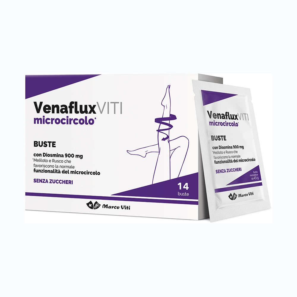 VENAFLUXVITI microcircolo BUSTE è un integratore alimentare a base di Diosmina, Meliloto e Rusco.